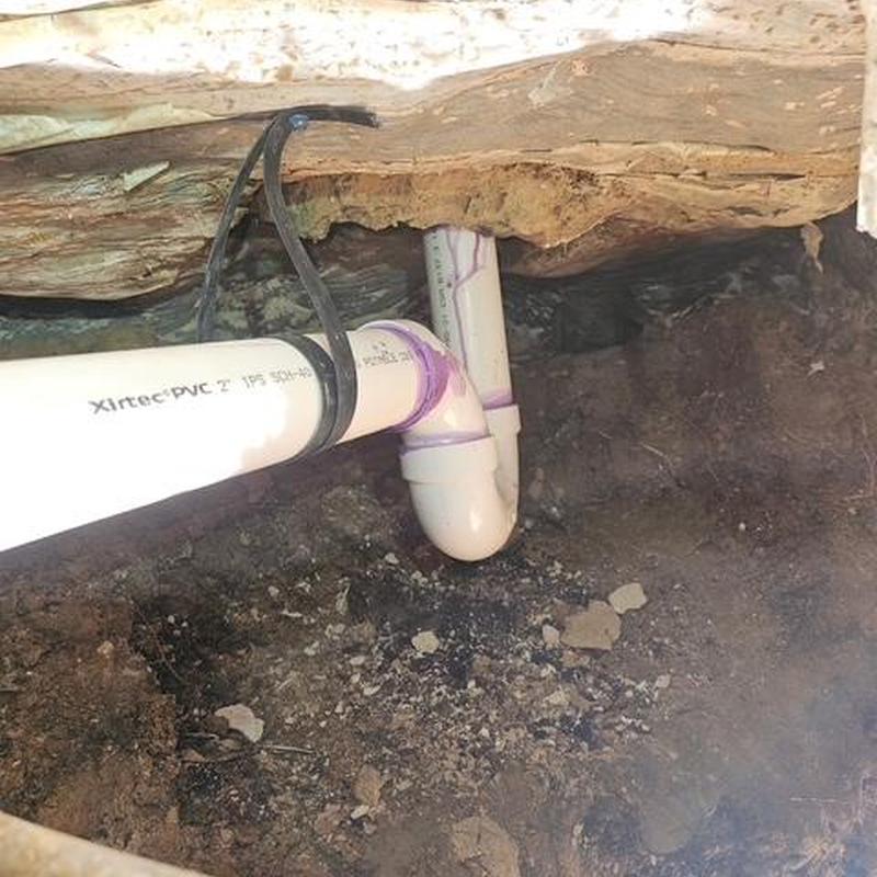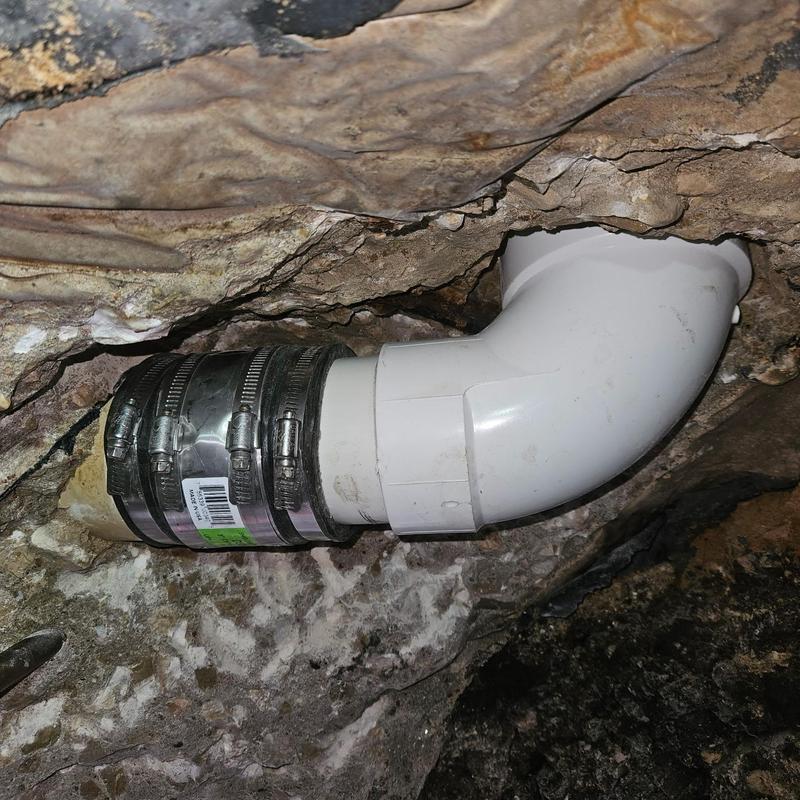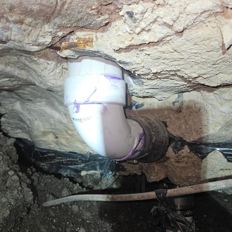 Plumbing Dynamics tunneled from the side of a house in Preston Hollow, Dallas to access and replace a 3-inch bathroom drain line. The team installed a new 4-inch line and connected it to a newly installed toilet. The original installation lacked proper concrete support around the drain.