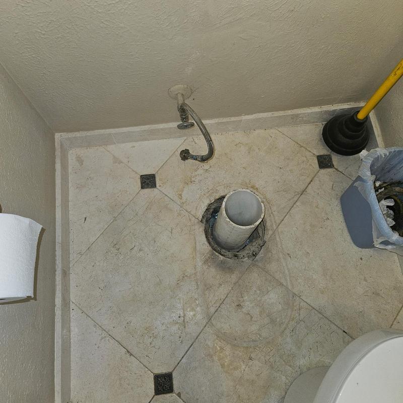 Plumbing Dynamics repaired a damaged toilet flange in a master bathroom in Richardson, Texas. The team tunneled six feet to access and replace the compromised piping with new PVC. They then installed a new flange and set a new toilet for proper fixture support and sealing.