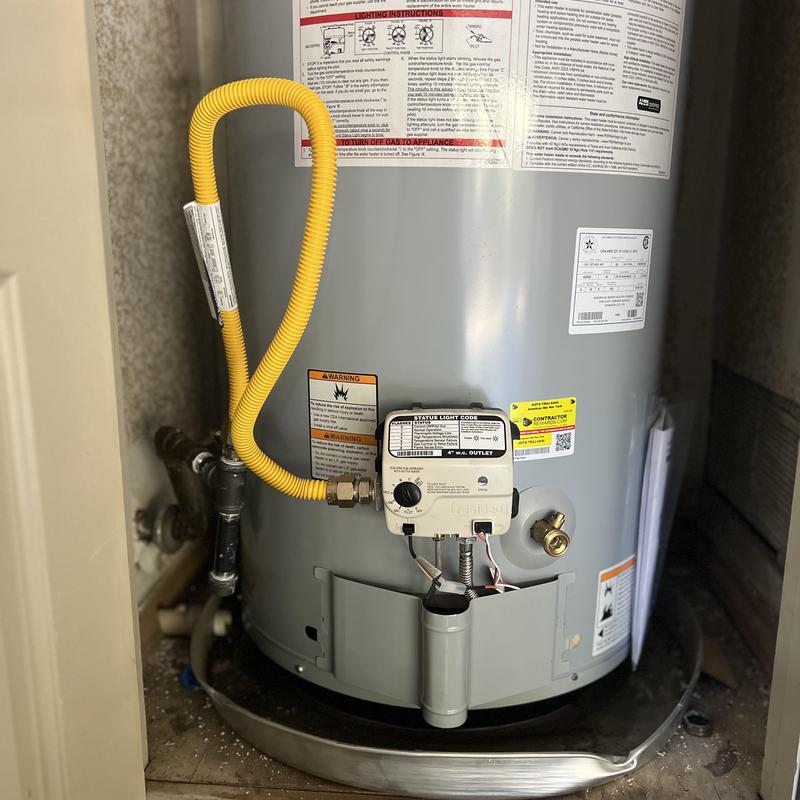 Plumbing Dynamics installed a 50-gallon gas water heater in a garage in Carrollton, Texas. The work included adding a new sediment trap, flexible supply lines, and a drain pan to support safe and efficient water heating.