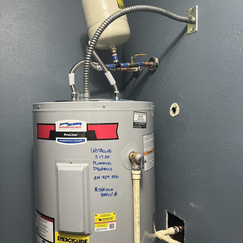 Plumbing Dynamics installed a 50-gallon gas water heater, a new sediment trap, and an expansion tank in Carrollton, Texas. This setup supports efficient hot water delivery while meeting safety and code requirements.